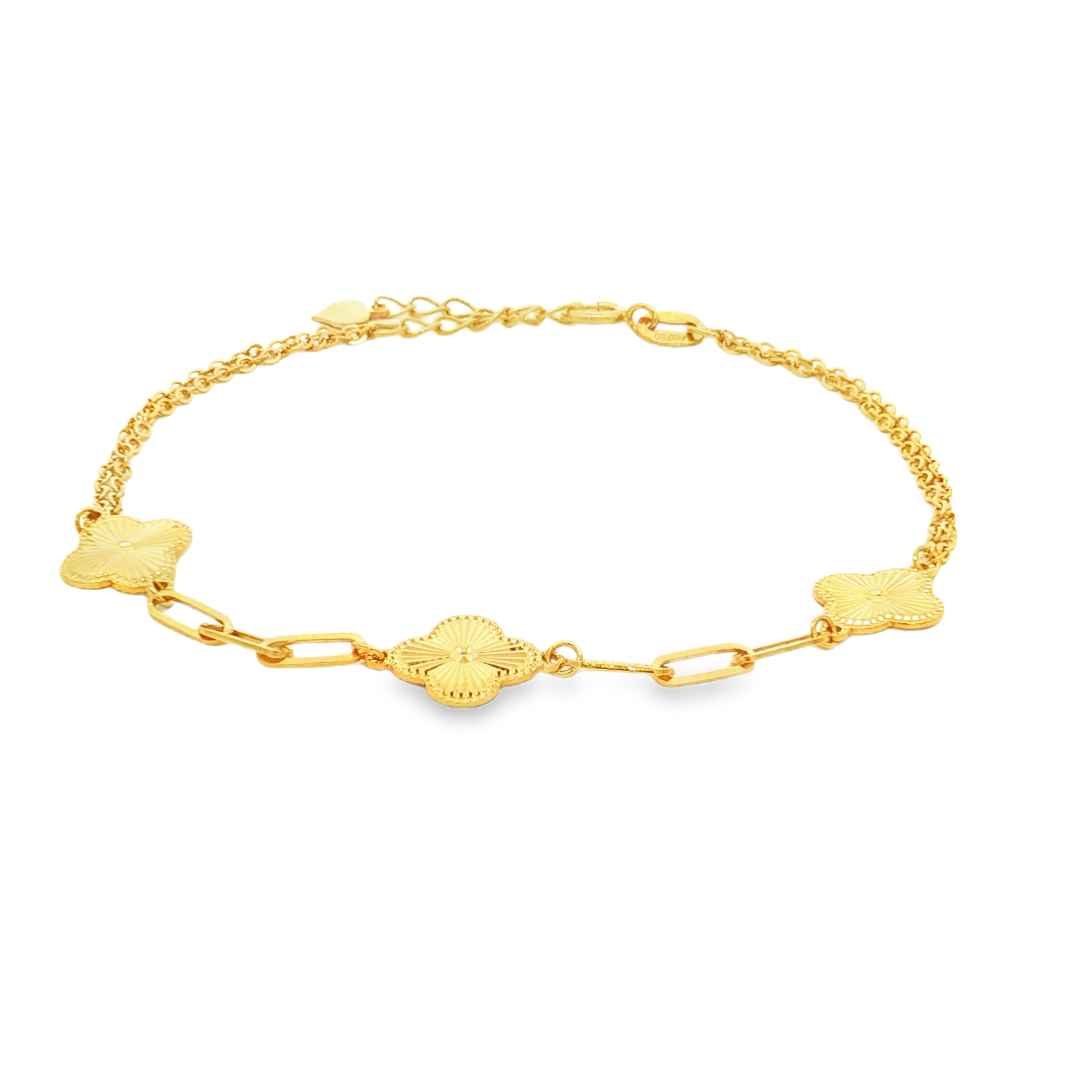 這款精緻的18K黃金鏈條手鍊,以其獨特的四葉草圖案設計,為您的造型增添一抹優雅氣息。採用優質黃金打造,鏈條細膩,光澤流動,完美展現您的品味與風格。無論是日常穿搭還是特殊場合,都能成為眾人矚目的焦點。