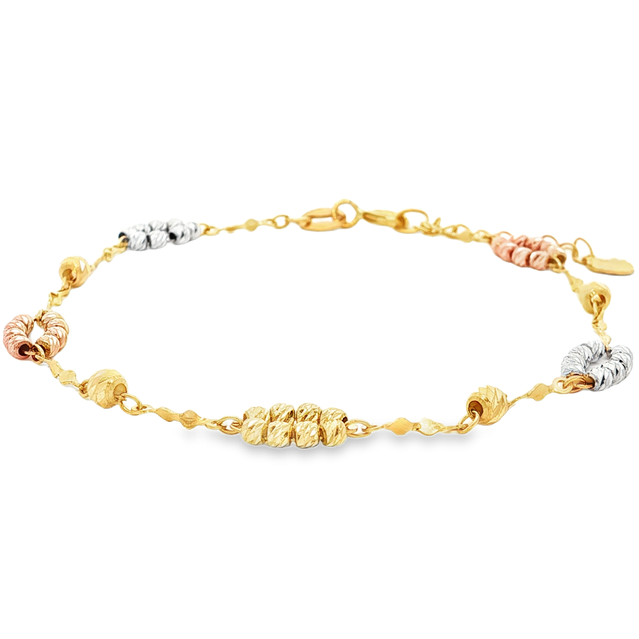 這款精緻的18K黃金手鍊,以其獨特的鏈條設計和精巧的圓珠點綴,展現出優雅與時尚。多種金色的圓環相間排列,增添了視覺層次感和設計感。適合日常佩戴,為您的造型增添一抹亮麗。