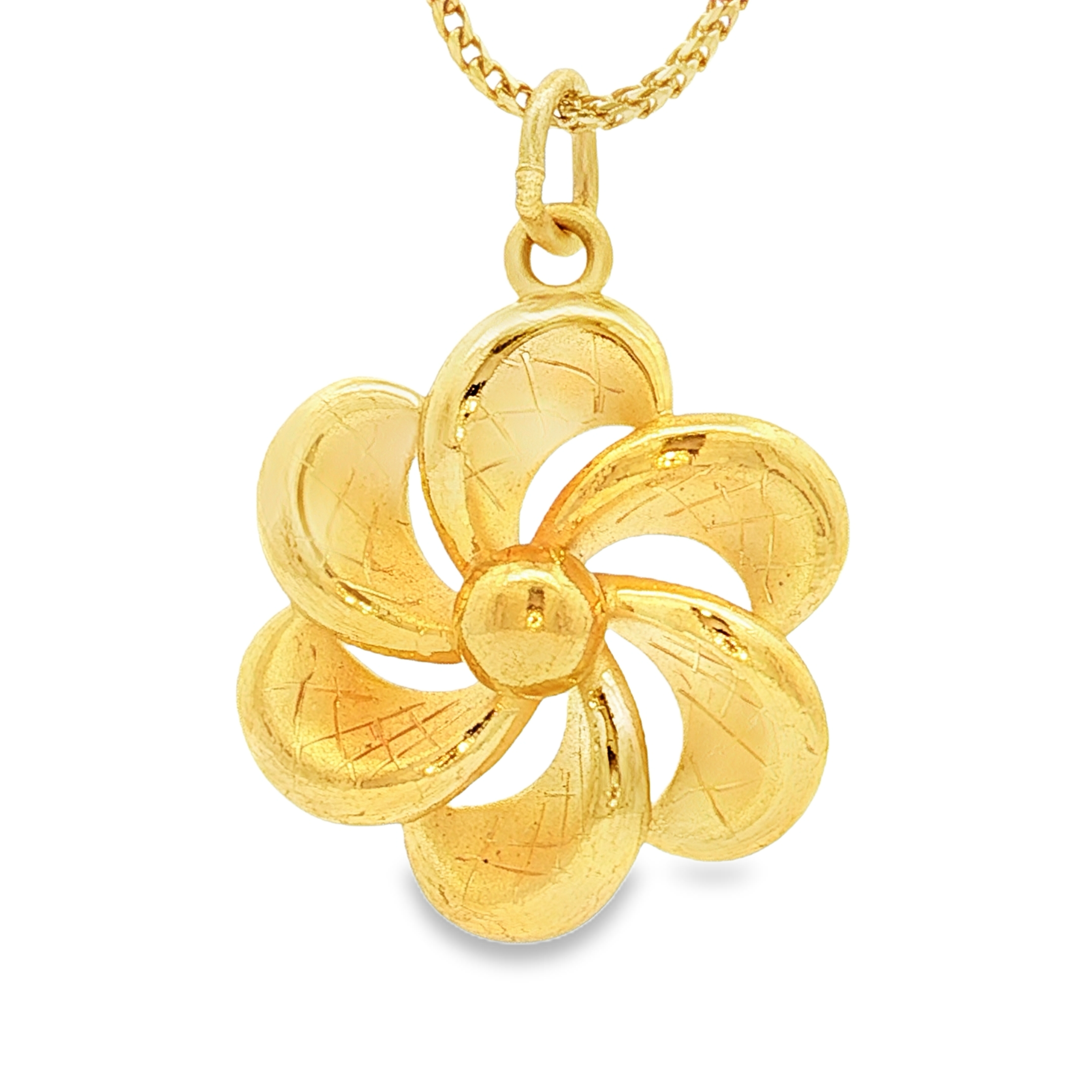 這款精美的黃金吊墜,以精湛工藝打造出花朵造型,線條流暢,設計典雅。黃金材質散發出溫潤光澤,為您的造型增添一抹奢華氣息。無論是日常佩戴還是特殊場合,都能展現您的獨特品味