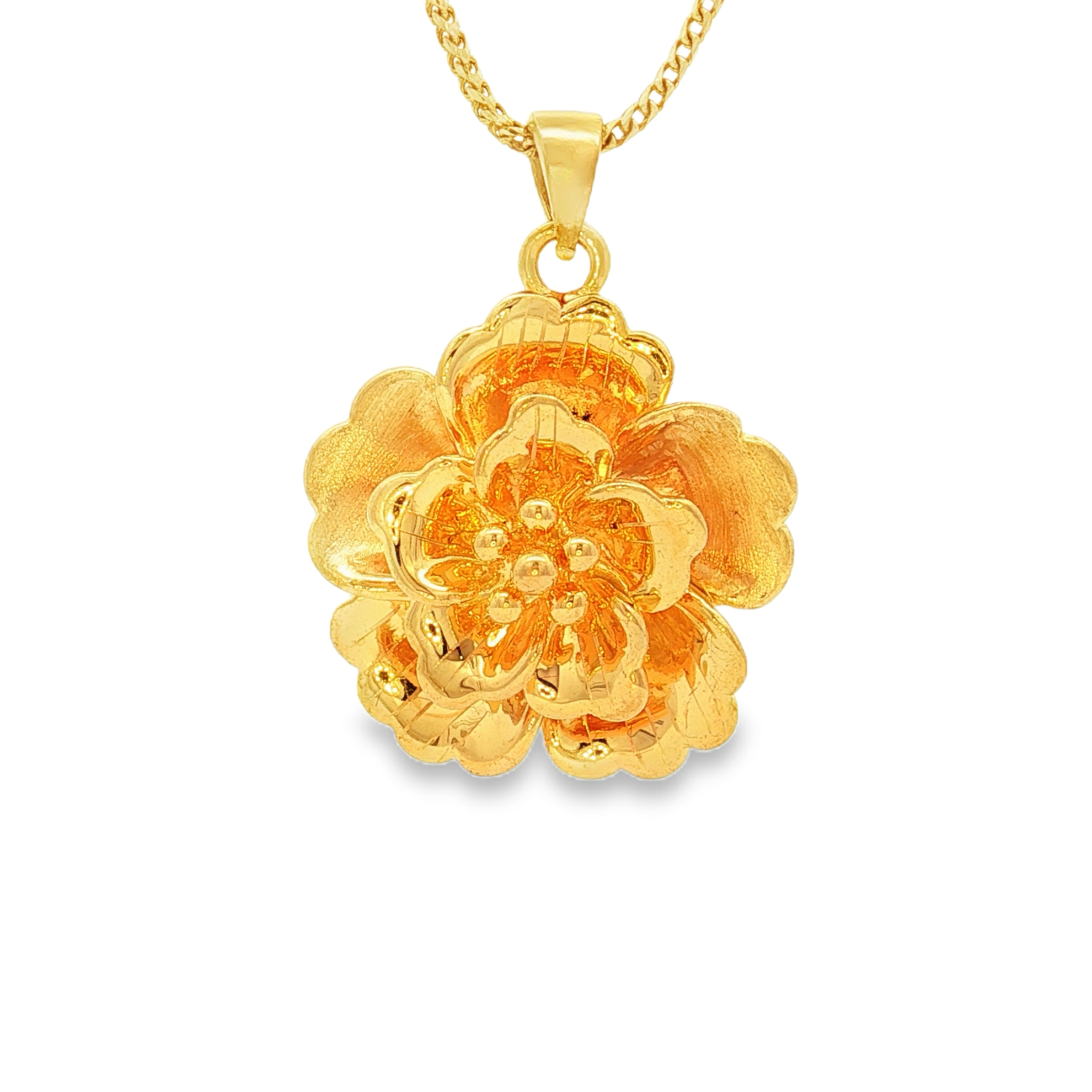 這款優雅的黃金吊墜,以精緻的花朵造型呈現,設計獨特,線條流暢。黃金材質散發著溫潤的光澤,為佩戴者增添一份高貴氣質。適合日常佩戴,亦是贈送親友的理想選擇。