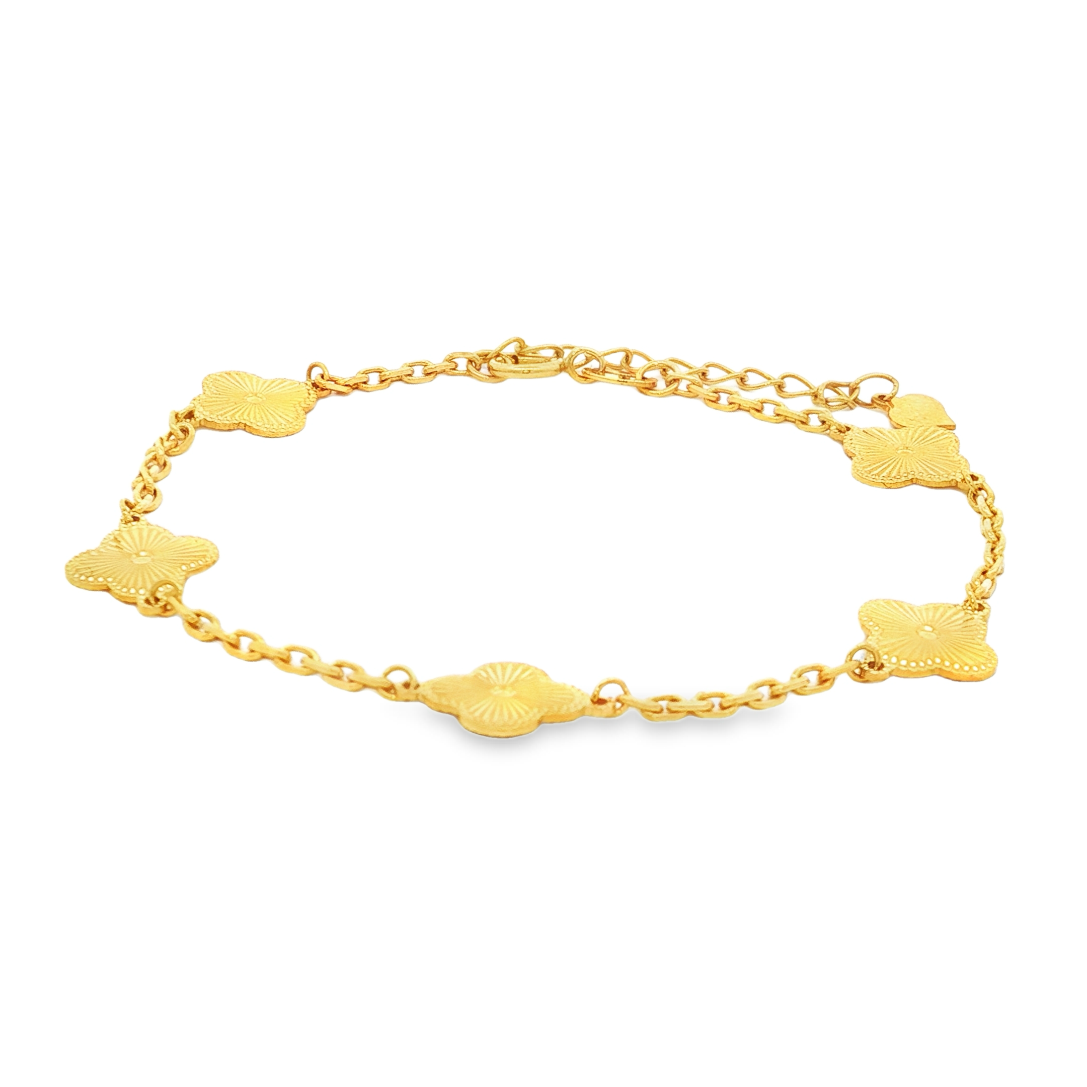 這款精緻的18K黃金手鍊,以經典的鏈條設計為主體,點綴著精巧的花朵造型吊飾。黃金材質散發著溫潤的光澤,為手腕增添一抹優雅的氣息。適合日常配戴,展現低調奢華的品味。