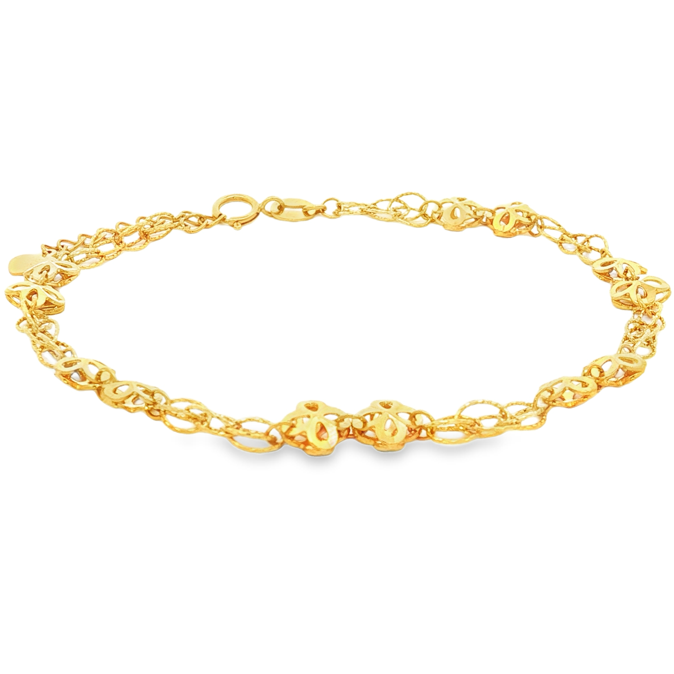 這款精緻的18K黃金鏈條手鍊,以其獨特的設計和精湛的工藝著稱。採用優質黃金打造,呈現出溫潤的光澤和奢華的質感。鏈條的每個環節都經過精心打磨,確保佩戴的舒適度和耐用性。簡約而不失優雅的風格,無論是日常穿搭還是特殊場合,都能為您的造型增添亮點。
