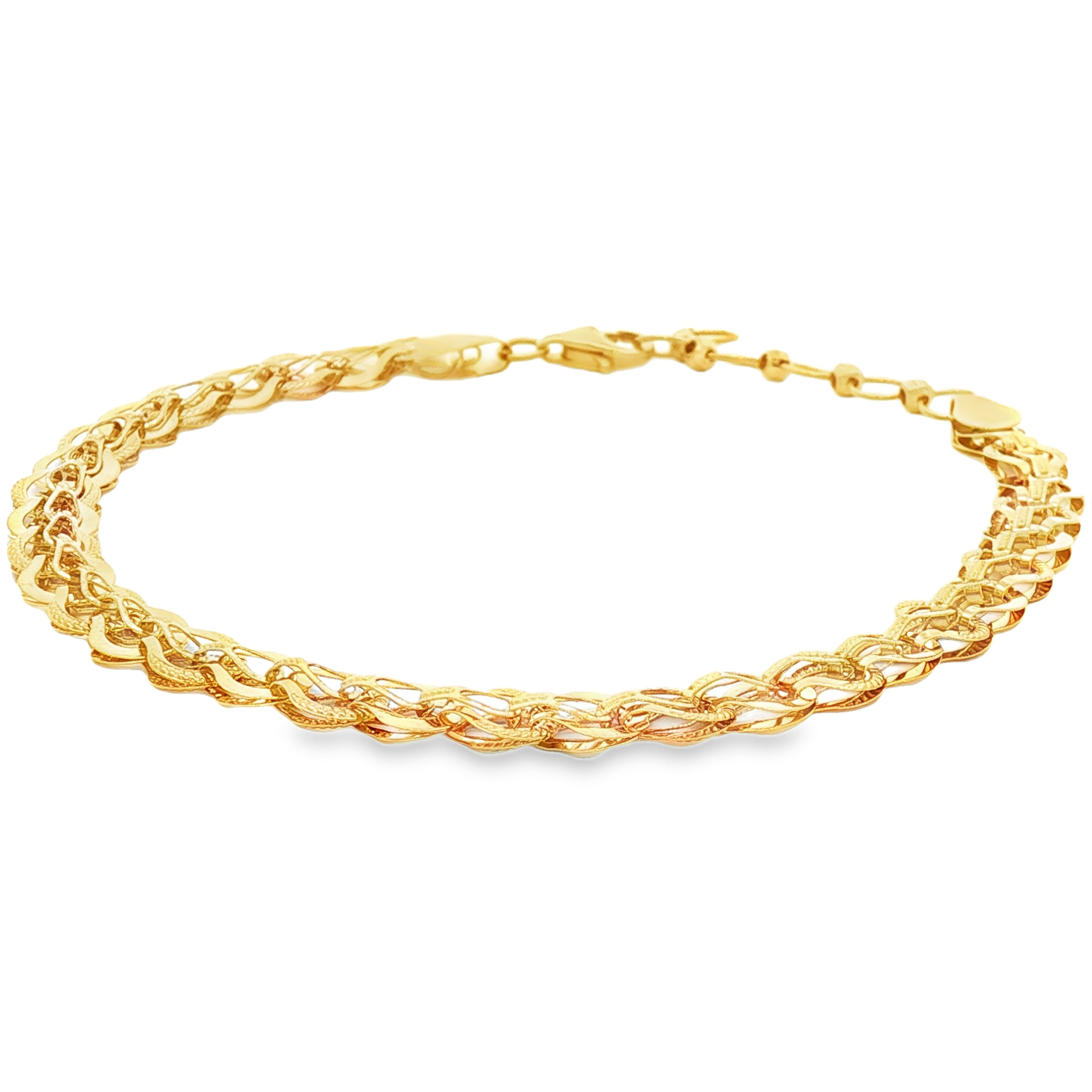 這款精緻的18K黃金鏈條手鍊,以其獨特的編織設計和精湛的工藝,展現出優雅和時尚感。適合日常佩戴,為您的造型增添一抹亮麗色彩。黃金材質保證了其持久的光澤和價值,是您珠寶盒中不可或缺的珍品。