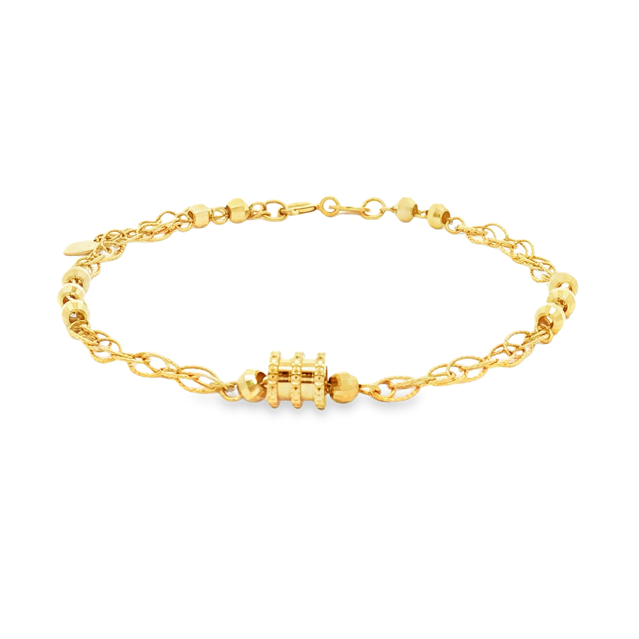 這款精緻的18K黃金鏈條手鍊,以其獨特的設計和精湛的工藝脫穎而出。手鍊由高品質黃金製成,鏈條的每個環節都經過精心打磨,呈現出流暢而閃耀的光澤。手鍊的中央裝飾有獨特的圓柱形設計,為整體增添了一絲現代感和藝術氣息。適合日常佩戴,也能為特殊場合增添