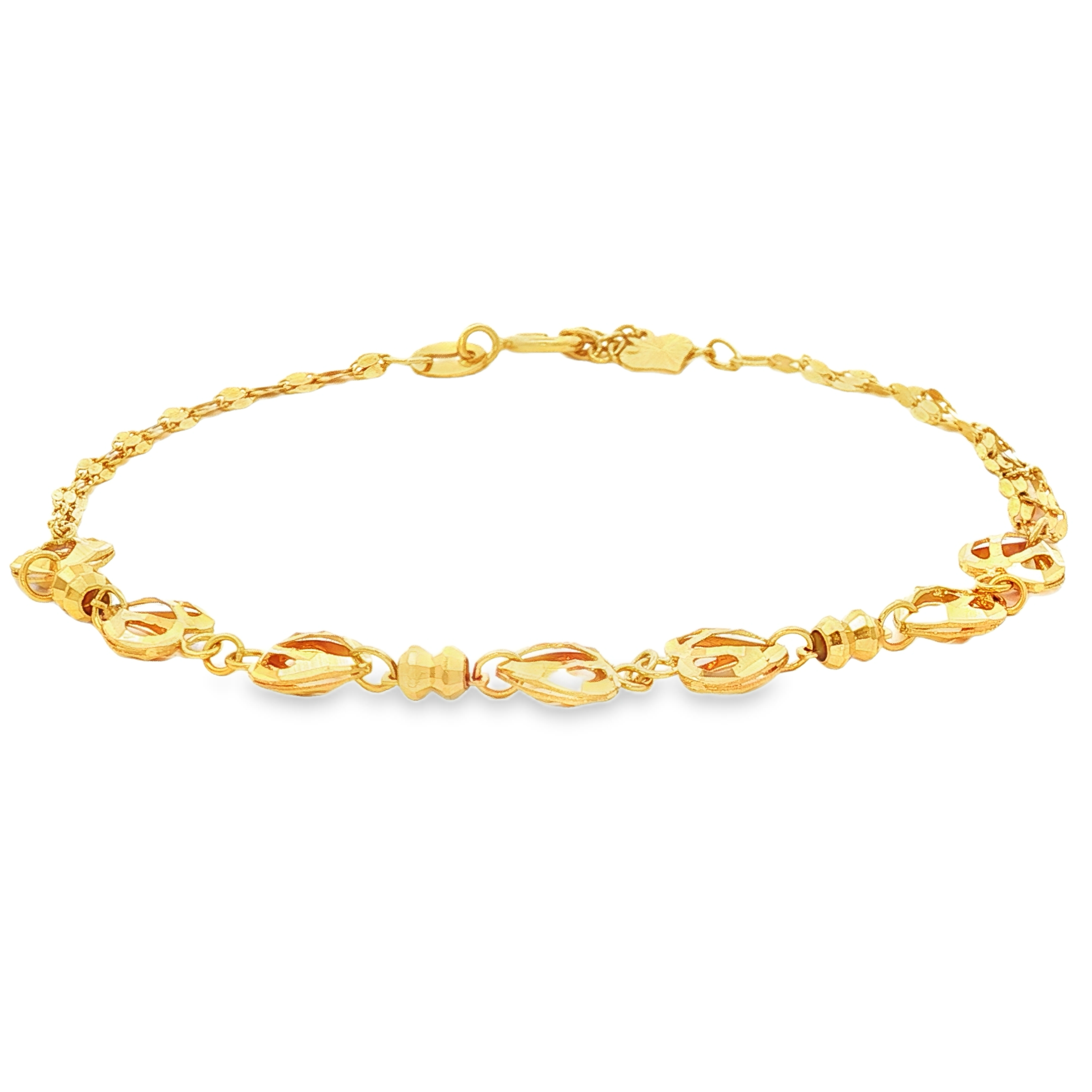 這款精緻的18K黃金手鍊,以其精巧的鏈條設計和流暢的線條,展現了簡約而優雅的風格。每個鏈節都經過精心打磨,呈現出迷人的光澤,為您的手腕增添一抹亮色。適合日常佩戴,亦可搭配其他首飾,展現您的個人魅力。