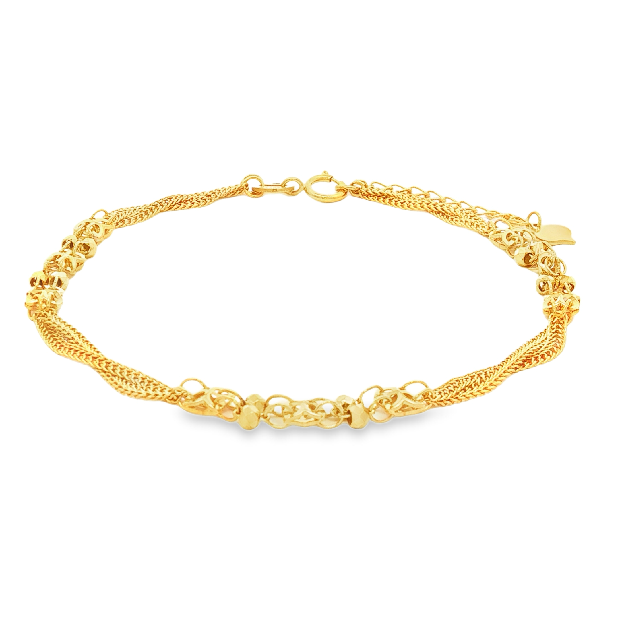 這款精緻的18K黃金鏈條手鍊,以其獨特的多層鏈條設計和精巧的金珠點綴,展現出優雅與時尚的完美結合。適合日常佩戴,為您的造型增添一抹亮麗的光彩。