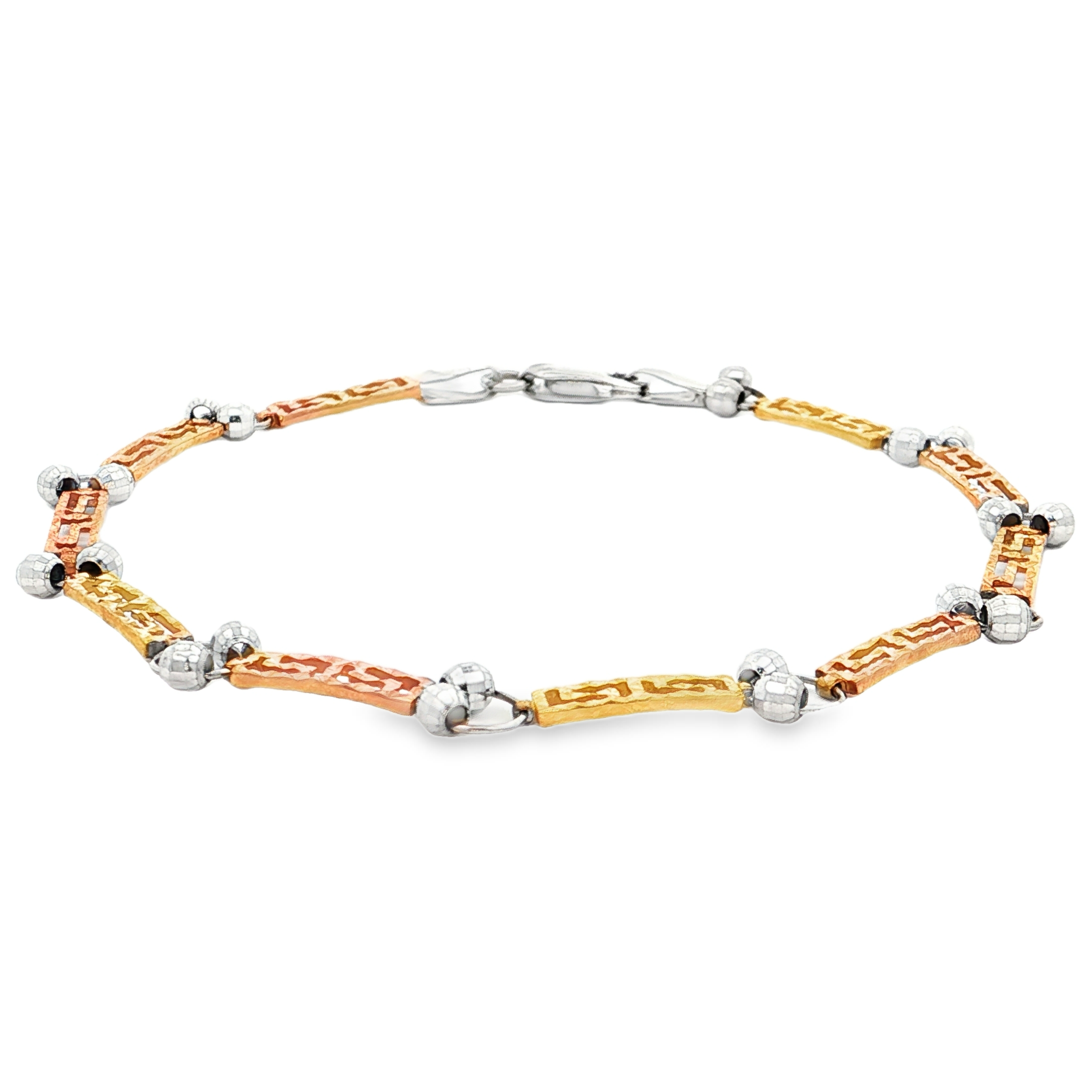 這款精緻的18K黃金手鍊,以其獨特的鏈節設計和精湛的工藝脫穎而出。每個鏈節都經過精心製作,呈現出精美的紋理和光澤。間隔的銀色小球增添了現代感,使整體設計更具層次和動感。這款手鍊不僅是時尚的配飾,也是品味的象徵。