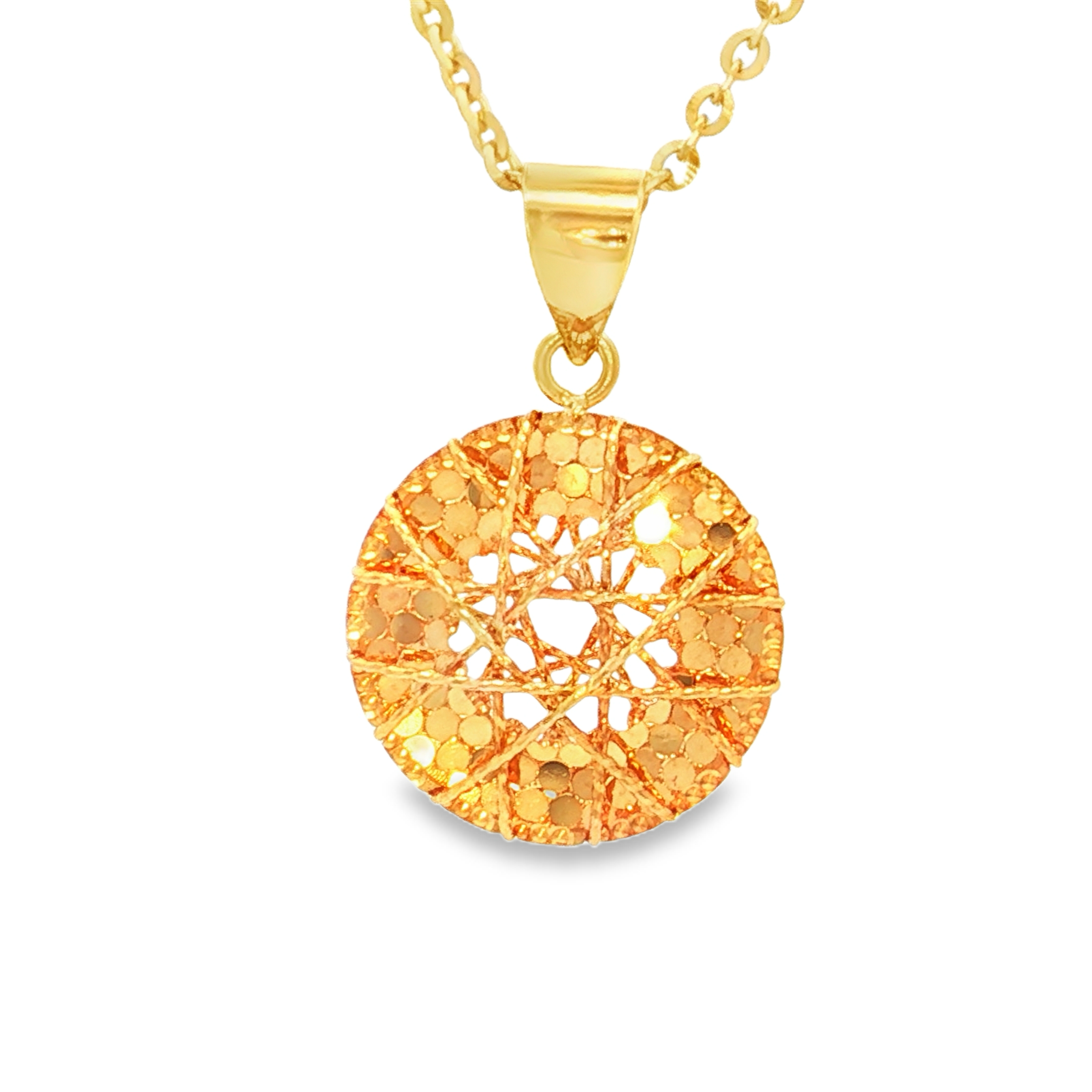 這款精緻的18K黃金吊墜項鍊,以其獨特的圓形鏤空設計,展現出精湛的工藝和時尚感。黃金材質散發溫潤光澤,為您的造型增添一抹優雅氣息。適合日常佩戴,亦是贈送親友的理想之選。