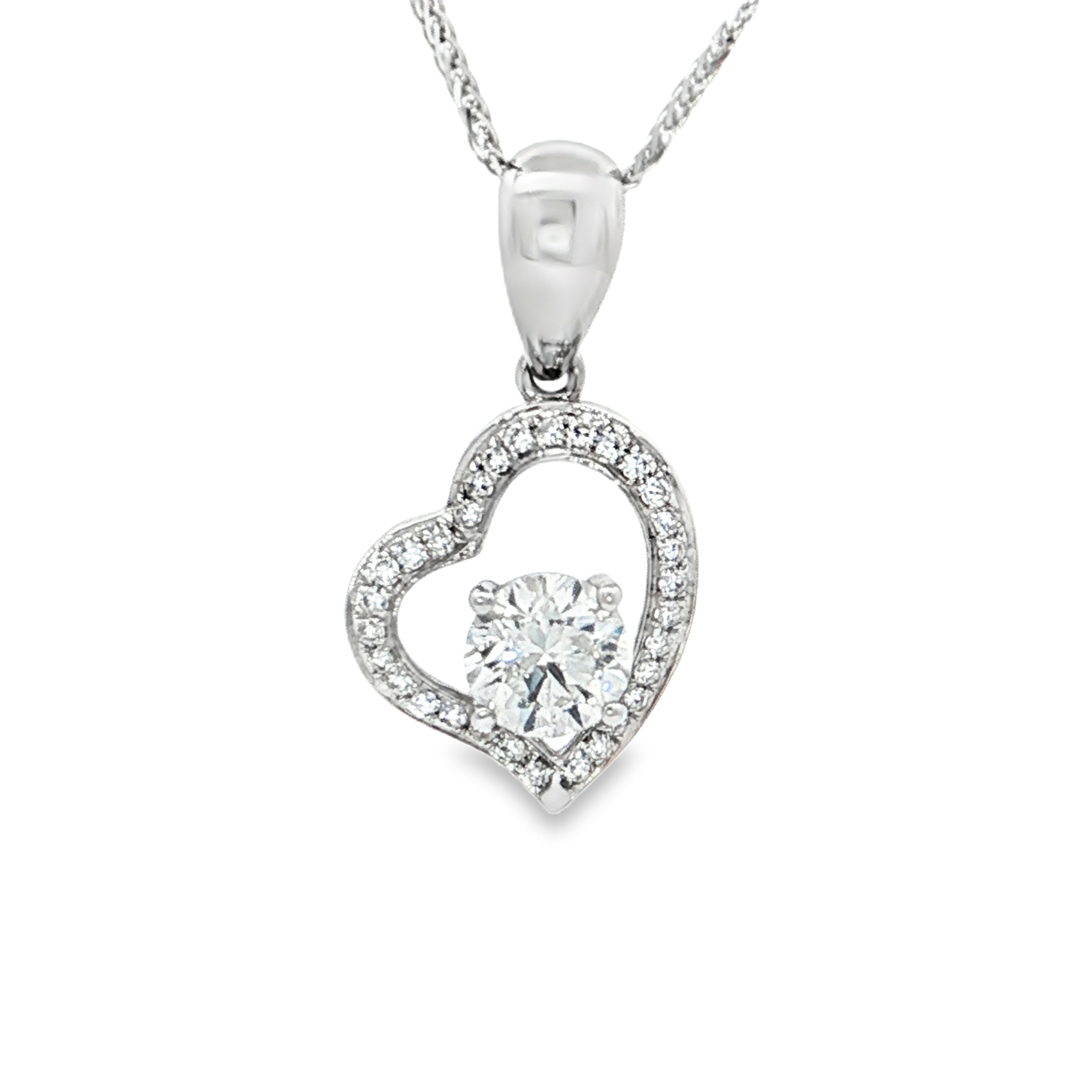 這款精緻的吊墜項鍊以18K金打造,呈現優雅的白色K金光澤。吊墜設計為心形,鑲嵌明亮式切割的圓形鑽石,閃耀奪目光芒。鑽石的精湛切割和完美對稱,使其散發出無與倫比的火彩,是日常穿搭或特殊場合的理想選擇。