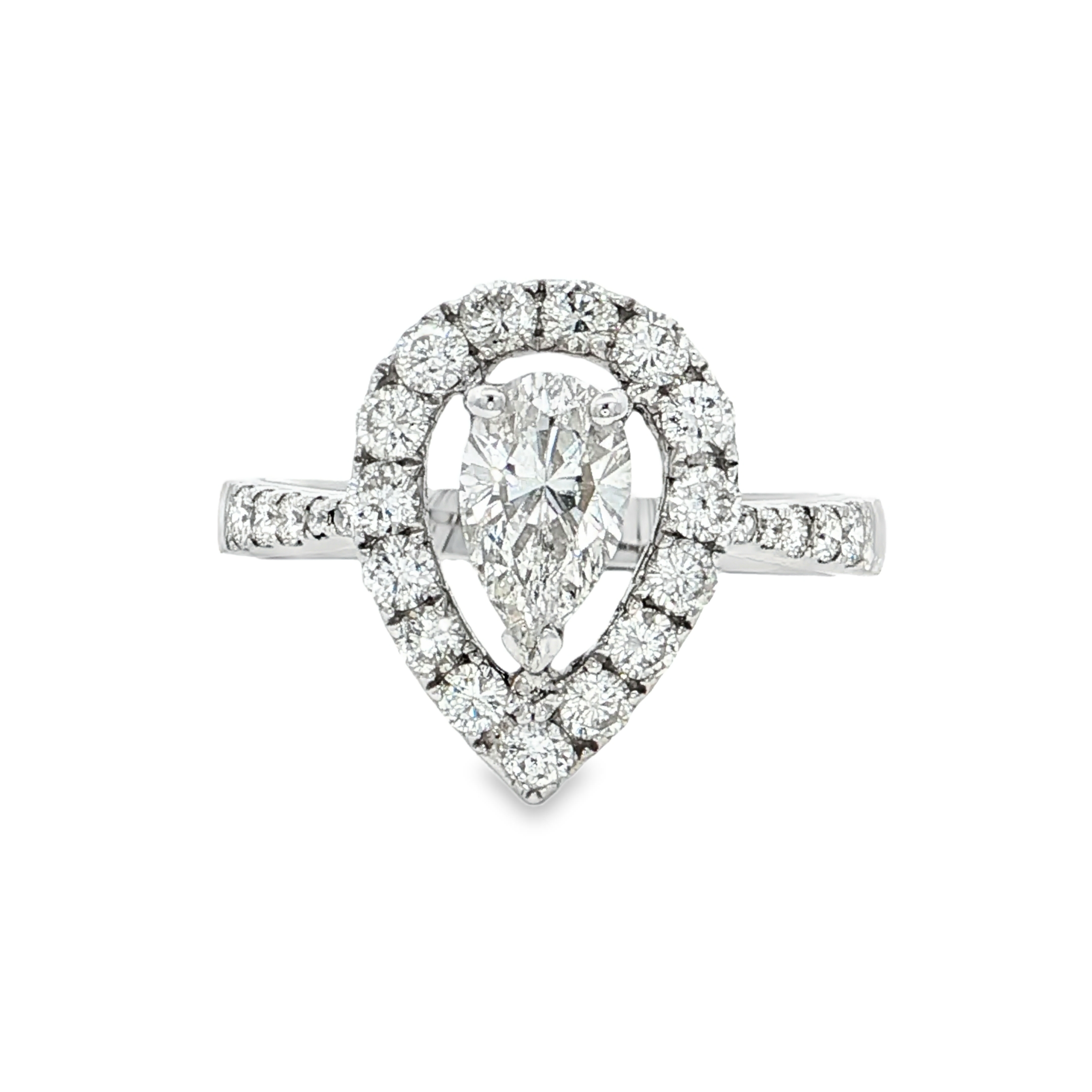 這款精緻的訂婚戒指採用18K金打造,呈現出永恆的優雅。主鑽為梨形明亮式切割鑽石,光芒四射,璀璨奪目。戒指設計簡約而不失精緻,適合追求經典與優雅的您。白色黃金的戒托更襯托出鑽石的純潔與光彩,是愛情與承諾的完美象徵。