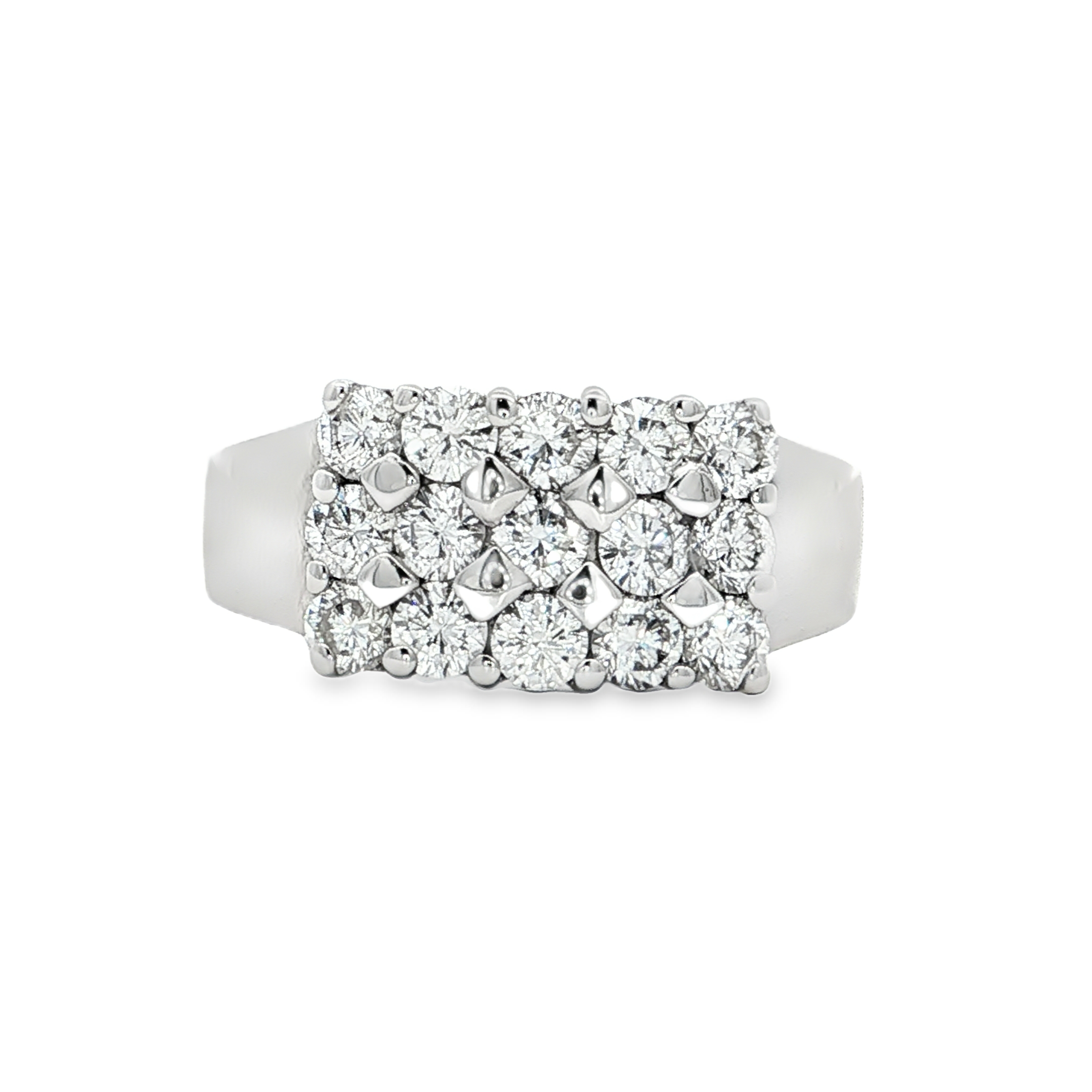 這款白金多石戒指,以精湛工藝鑲嵌多顆圓形明亮式切割鑽石,璀璨奪目。鑽石排列精巧,呈現出和諧的美感。白金材質更襯托出鑽石的純淨光芒,適合日常佩戴,展現低調奢華。