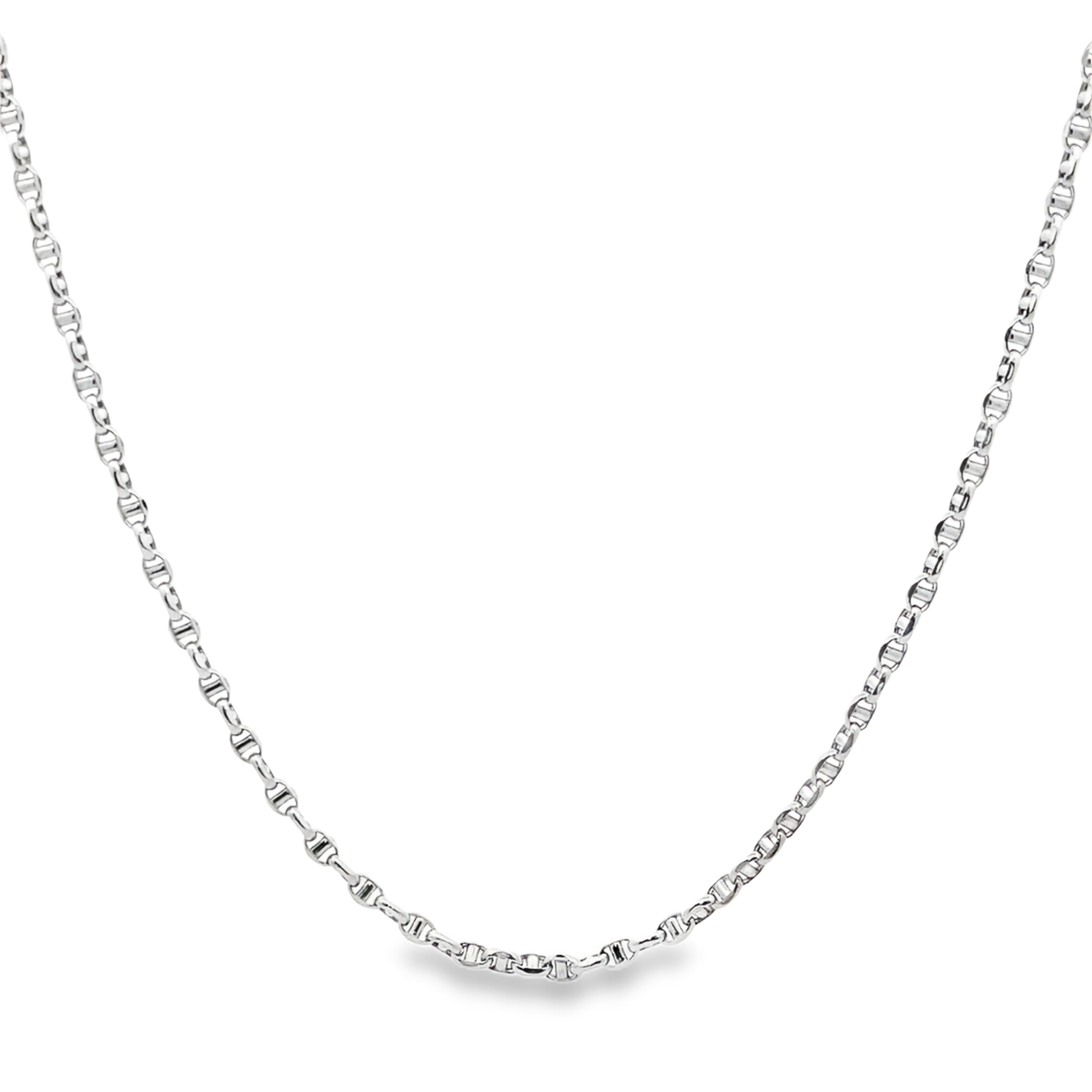 這款精緻的純銀項鍊採用經典的船錨鏈設計,鏈條由相互連接的橢圓形和長方形鏈節組成,呈現出簡約而現代的風格。銀色的光澤賦予其優雅的氣質,適合日常佩戴或搭配各種服裝,展現個人品味。