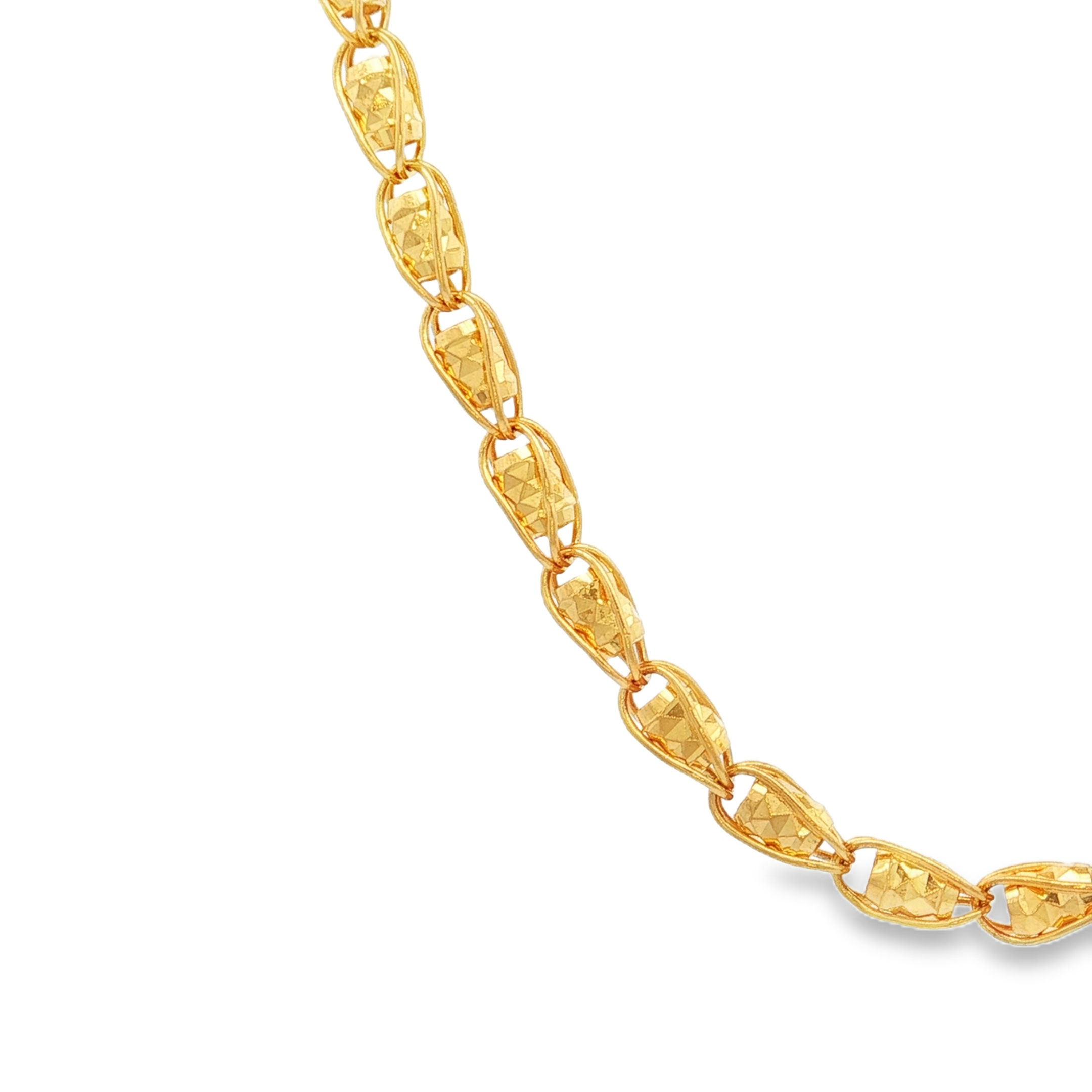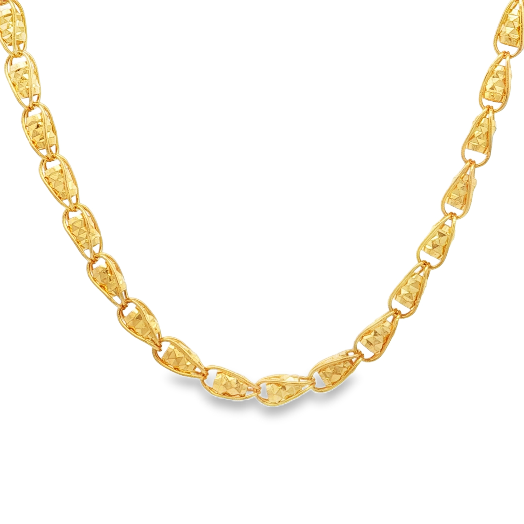 這款精緻的黃金鏈條項鍊,以其獨特的鏈節設計和精湛的工藝脫穎而出。每個鏈節都經過精心打造,呈現出流暢的線條和引人注目的光澤。此項鍊採用優質黃金製成,不僅具有優雅的外觀,更確保了其耐用性和持久的光彩。無論是搭配休閒裝扮還是正式晚禮服,都能為您的造型增添一抹亮麗的色彩。