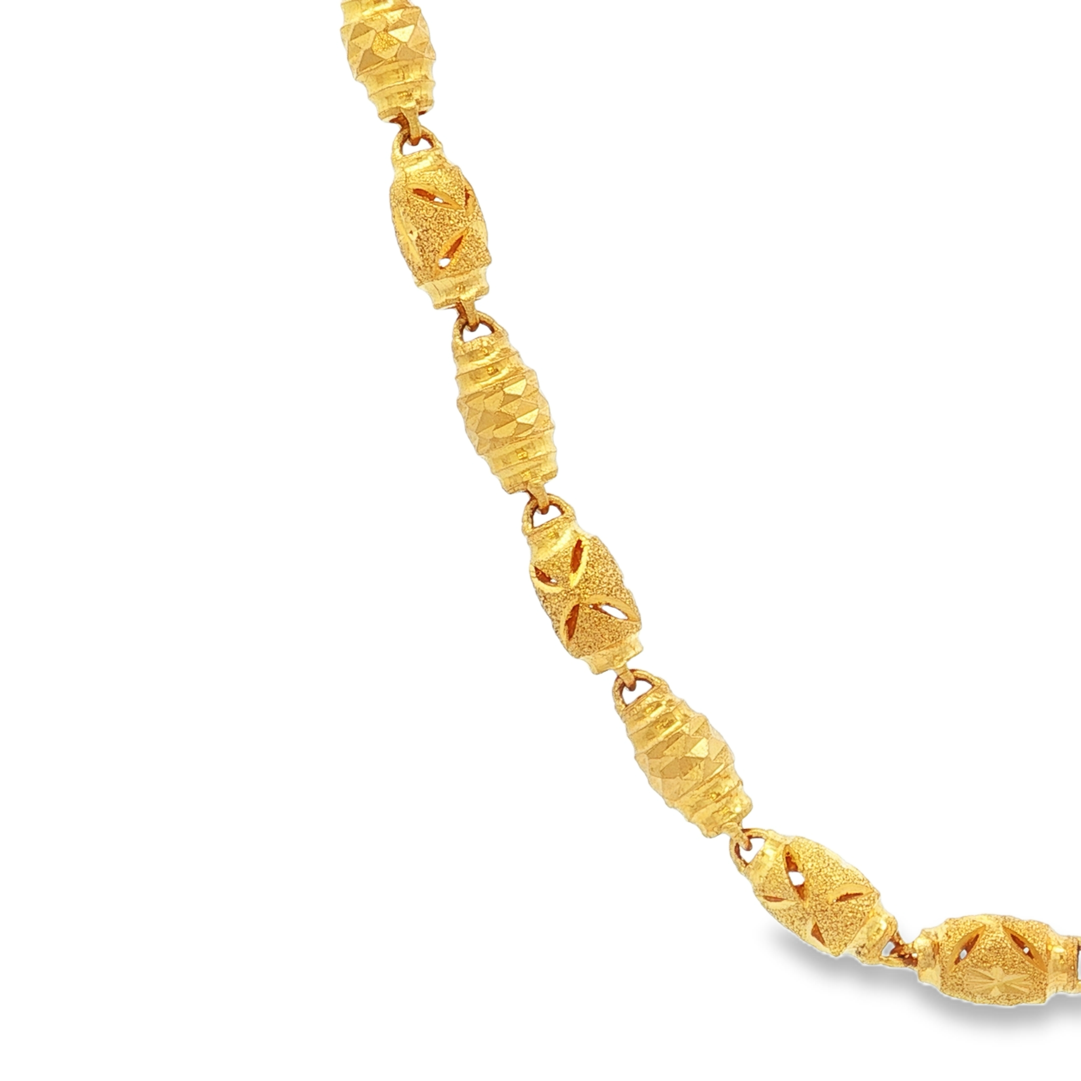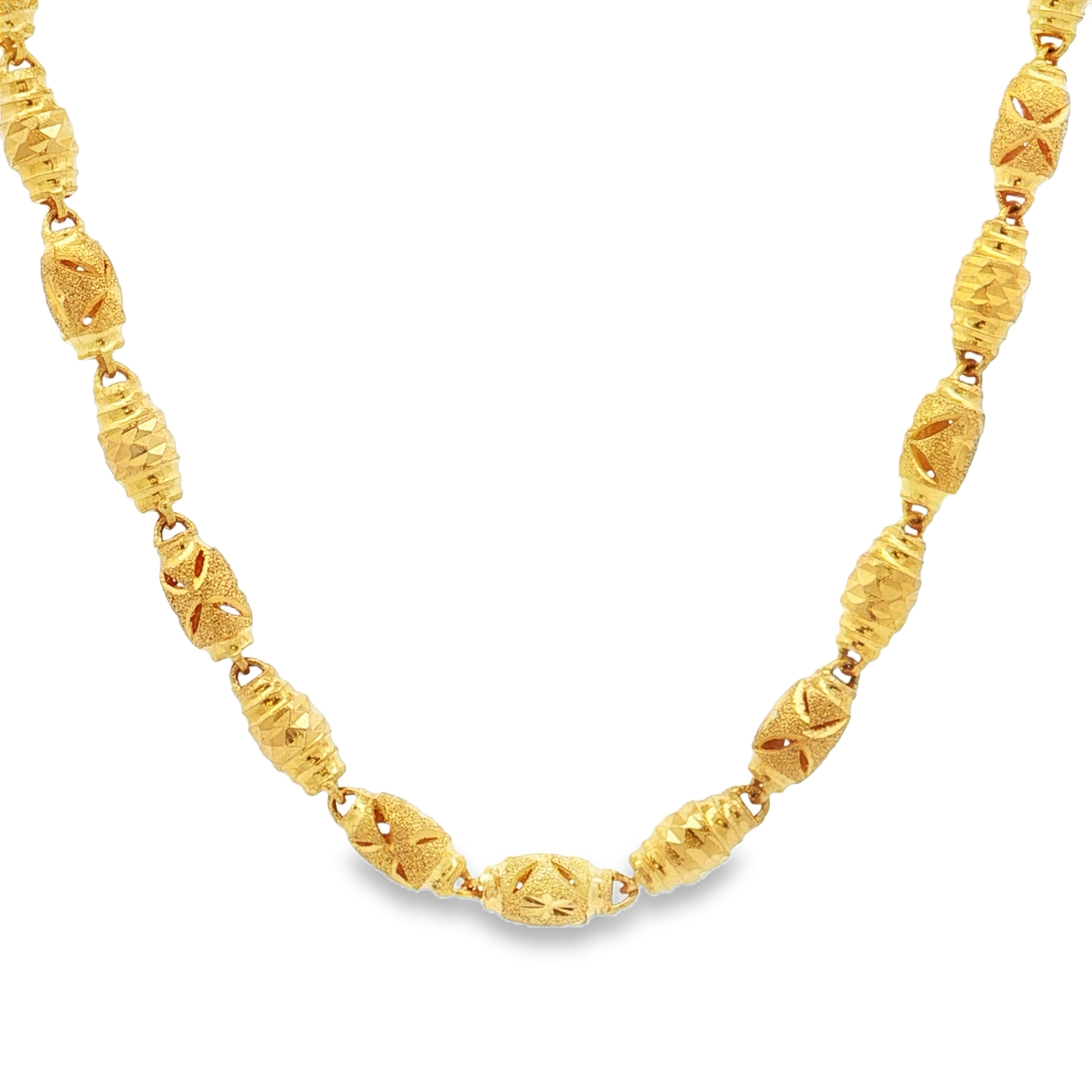 這款精緻的黃金鏈條項鍊,採用獨特的雕刻工藝,每個鏈節都經過精心設計,呈現出精美的幾何圖案,散發出古典而優雅的氣息。黃金材質的光澤與細膩的雕刻相互輝映,彰顯佩戴者的高貴品味與獨特風格,是日常穿搭或特殊場合的理想選擇。