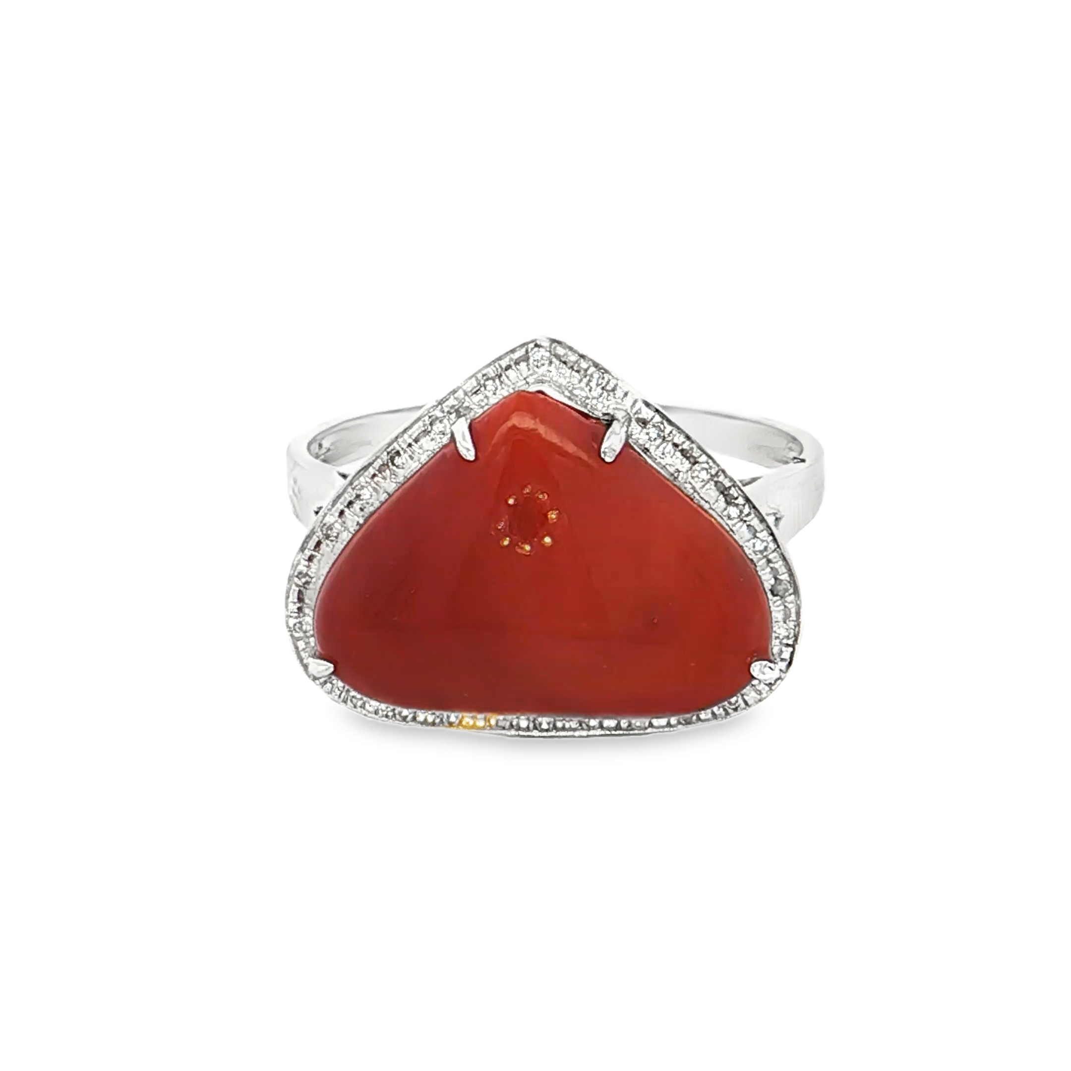 珊瑚主石採用凸圓面切割,呈現圓潤飽滿的造型,散發溫潤光澤。戒指設計時尚大方,適合各種場合佩戴,展現優雅品味。