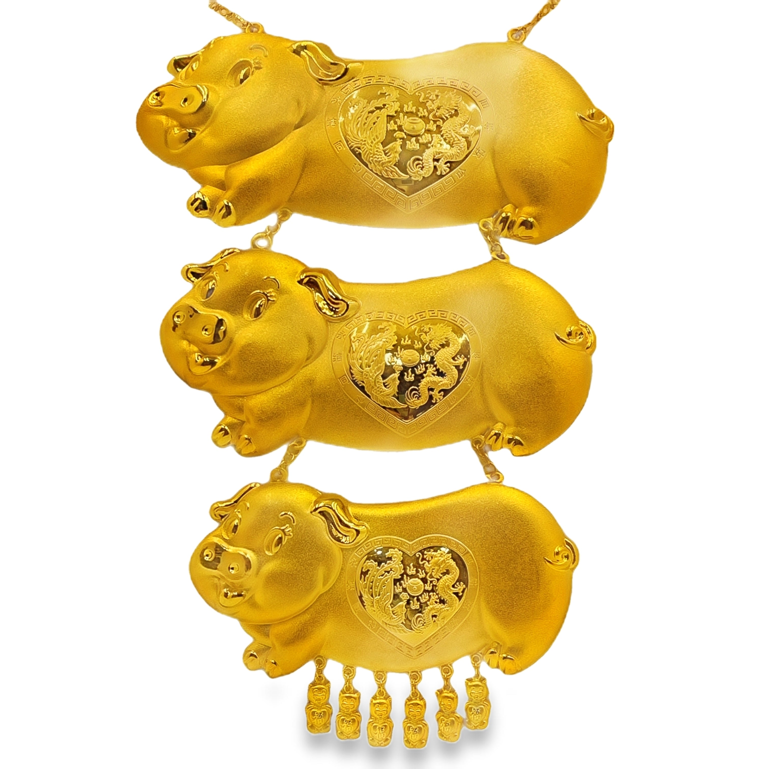 這款精緻的黃金吊墜,以三隻可愛的豬造型呈現,寓意吉祥如意,財源廣進。每隻豬身上都巧妙地設計了心形圖案,飾有精緻的龍鳳圖騰,象徵著幸福美滿和權勢地位。吊墜下方垂墜著一排精巧的小豬,增添了趣味性和童真,是新年或特殊節日的完美禮物,表達對親友的美好。