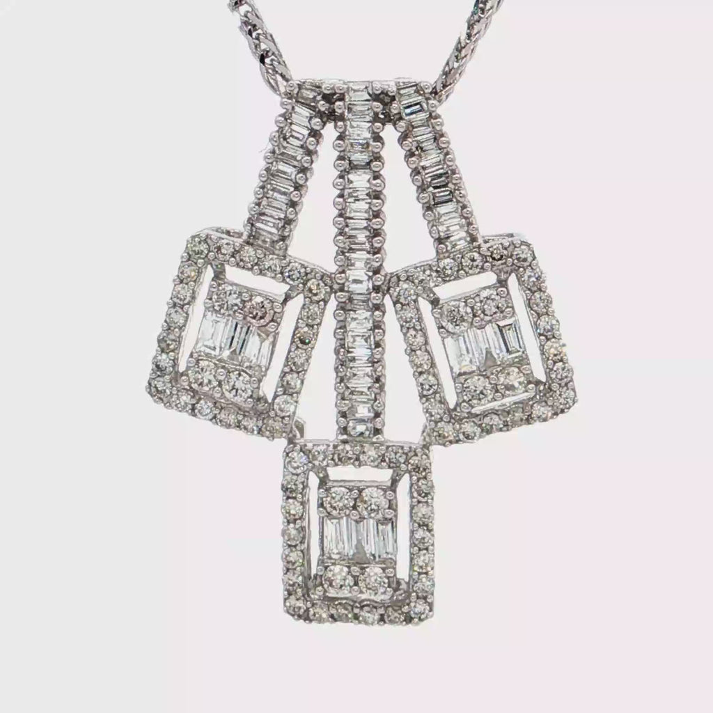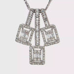 這款精美的鑽石項鍊採用雅的白K金,呈現出獨特的幾何美感。項鍊主體由多顆長棍形鑽石巧妙排列,璀璨的切割工藝,使鑽石散發出耀眼的光芒。整體設計精巧別緻,適合各種場合佩戴,為您的造型增添一份奢華與精緻。