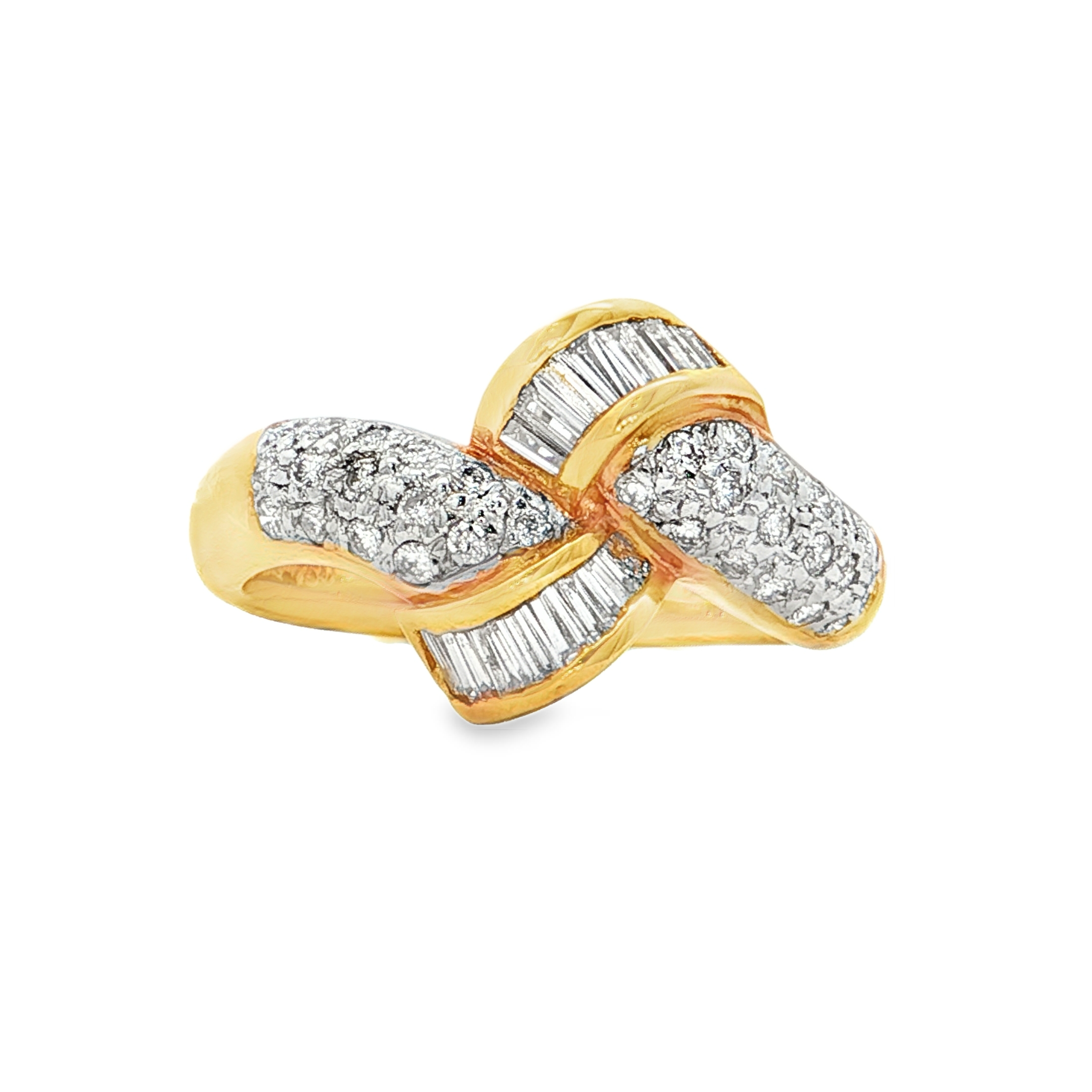 這款多石戒指採用溫潤的18K黃金打造,呈現出精緻的扭結造型。戒指上鑲嵌著多顆圓形明亮式切割鑽石,散發著耀眼的光芒。鑽石的完美切割和精湛的鑲嵌工藝,使其更加璀璨奪目,為您的造型增添一抹奢華氣息。