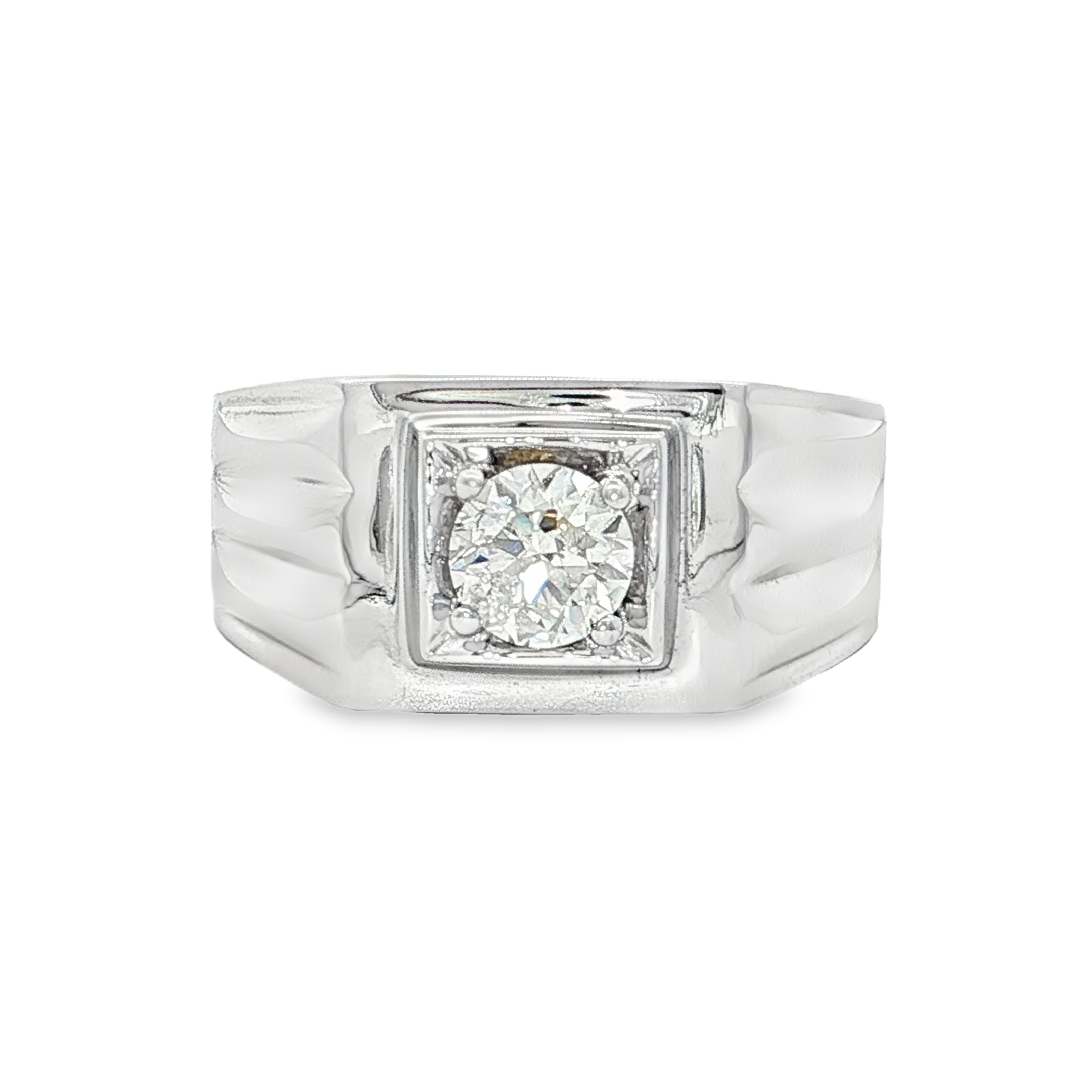 這款男士圖章戒指以精湛工藝打造,採用優質18K金為基底,並鍍以亮麗的白金光澤。戒指中央鑲嵌一顆圓形明亮式切割鑽石,散發璀璨光芒,彰顯佩戴者的高雅品味與獨特魅力。設計簡約大方,適合日常佩戴,是現代男士的理想之選。