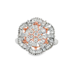 這款雞尾酒戒指採用精緻的18K白金打造,主石為圓形明亮式切割的鑽石,呈現出耀眼的光芒。鑽石的排列和切割均經過精心設計,確保每個角度都能捕捉光線,散發出迷人的火彩。戒指的整體設計時尚而奢華,適合在各種特殊場合佩戴,展現佩戴者的高雅品味和獨特魅力。