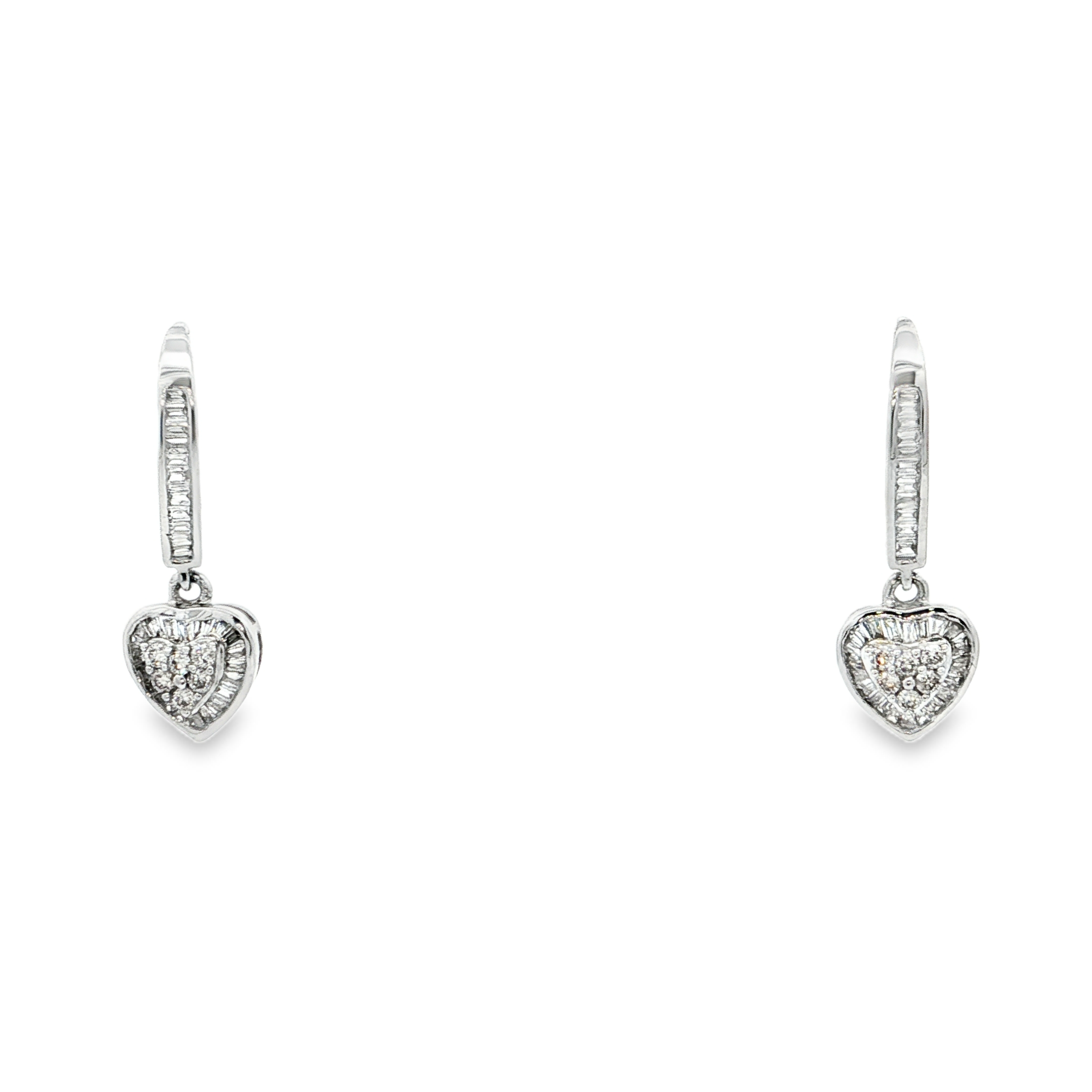 這款精緻的垂墜耳環以純銀為基底,並鍍上亮麗的18K白金光澤。心形設計鑲嵌明亮式切割鑽石,璀璨奪目,彰顯優雅氣質。耳環線條流暢,簡約而不失精緻,適合日常佩戴或特殊場合。