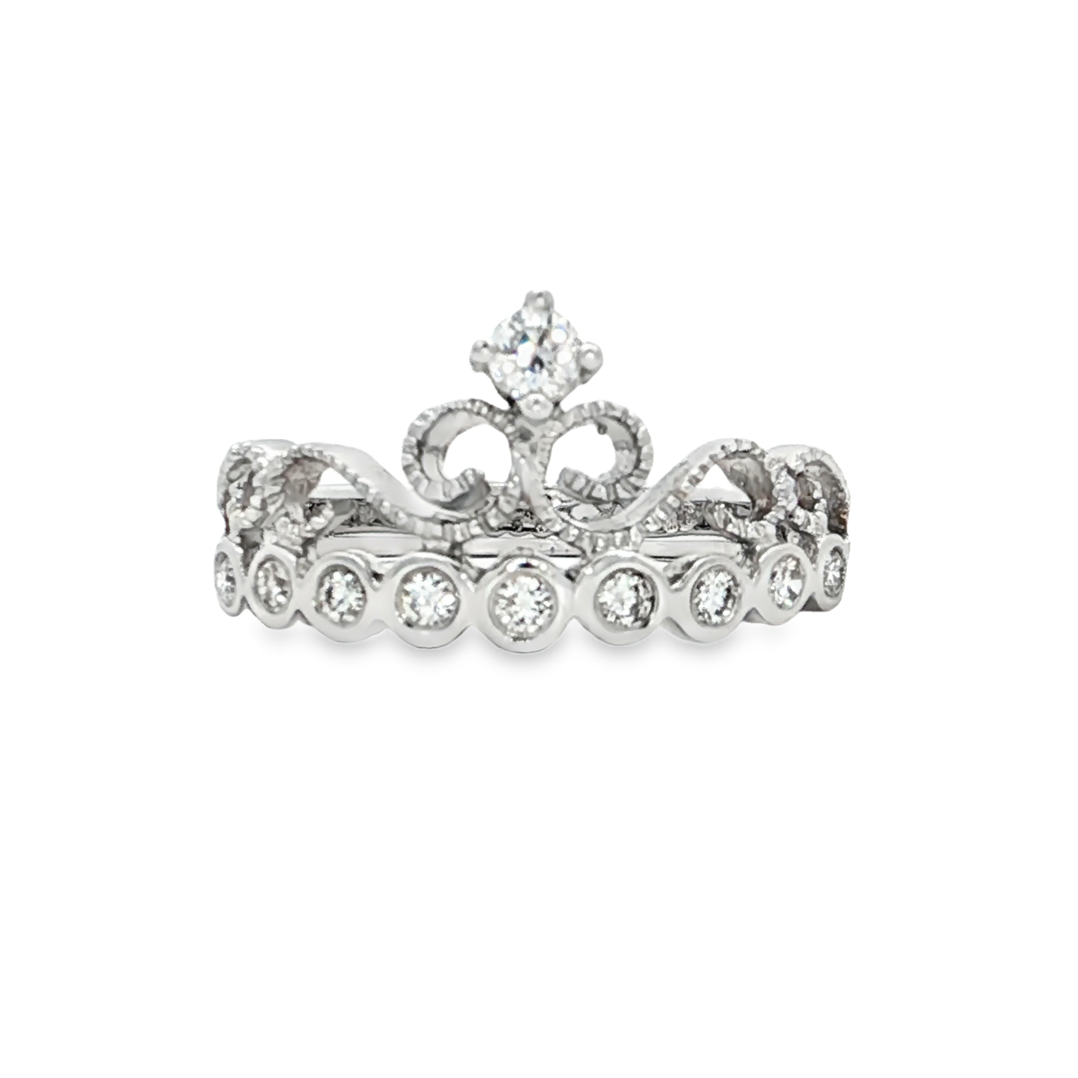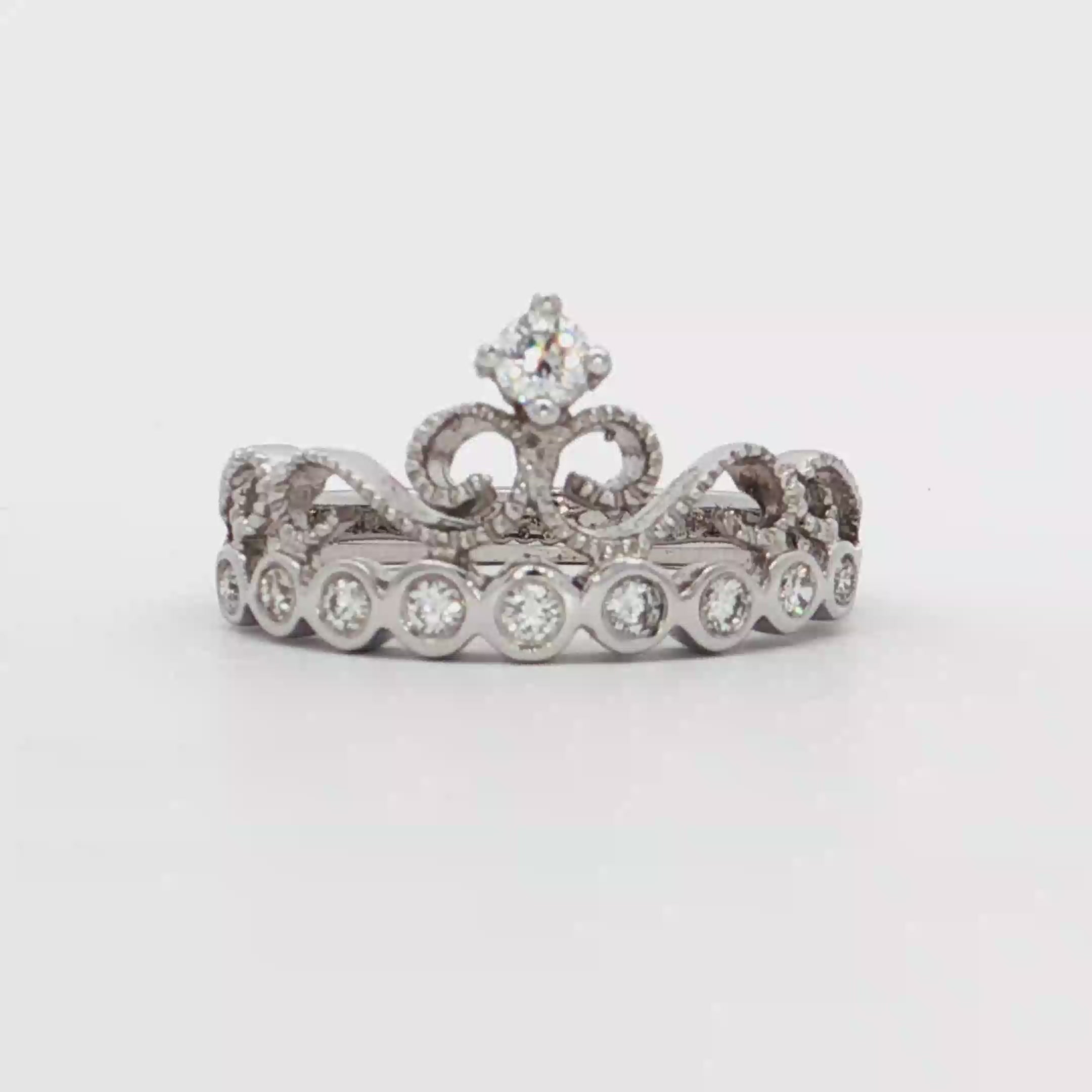 這款精緻的疊戴戒指採用優質18K金打造,並鍍以亮麗的白金光澤。戒指鑲嵌圓形明亮式切割鑽石,璀璨奪目。其獨特的設計和精湛的工藝使其成為您日常穿搭的完美點綴,亦可與其他戒指疊戴,展現個人風格。適合追求細膩與精緻的您。