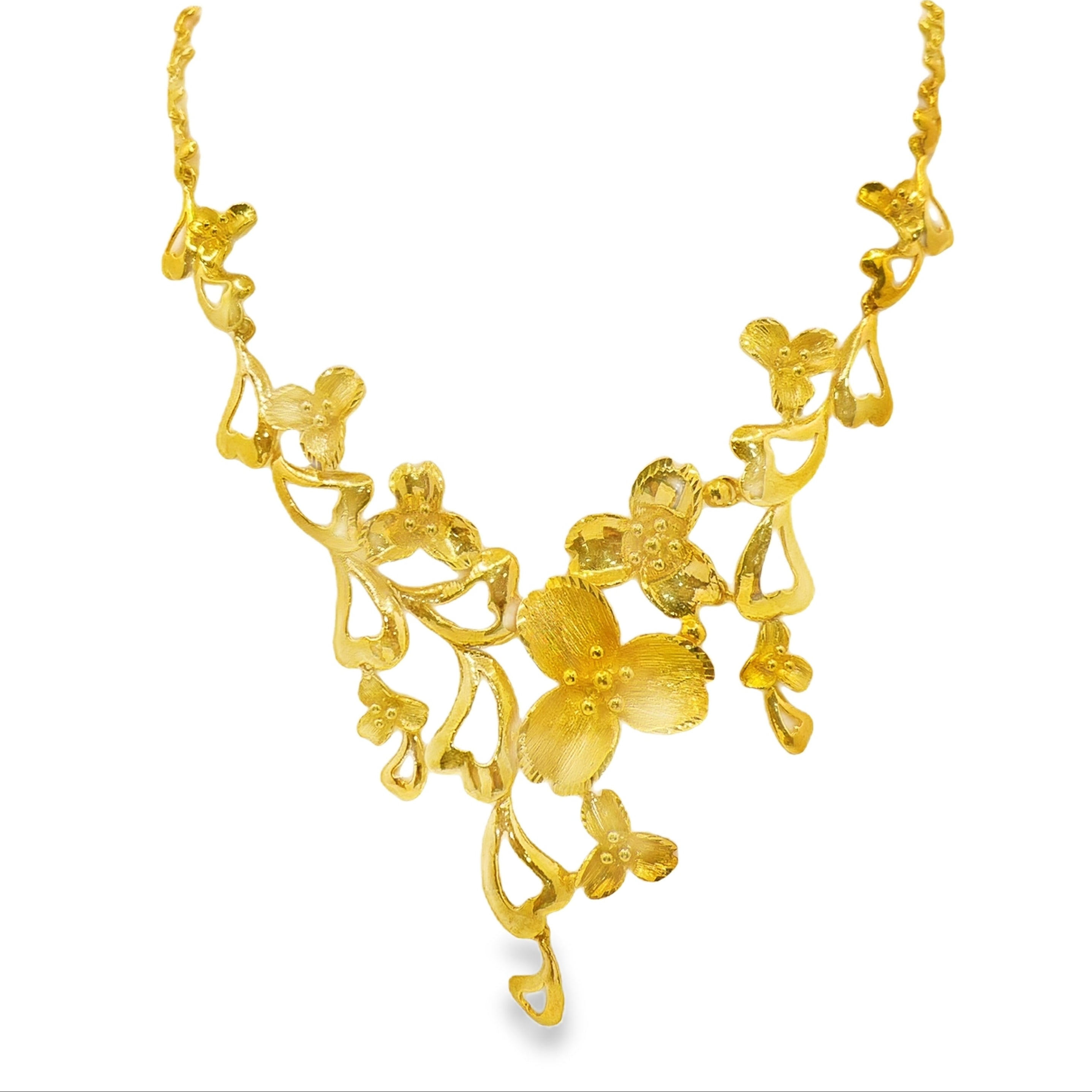這款精美的黃金吊墜項鍊,以精湛的工藝將花朵的柔美姿態栩栩如生地呈現。每一片花瓣都經過精細的雕琢,線條流暢而富有層次感,散發出溫潤的光澤。項鍊的設計獨具匠心,花朵與鏈條完美結合,既典雅又時尚,為您的頸間增添一抹亮麗的色彩。適合各種場合佩戴,展現您優雅迷人的氣質。