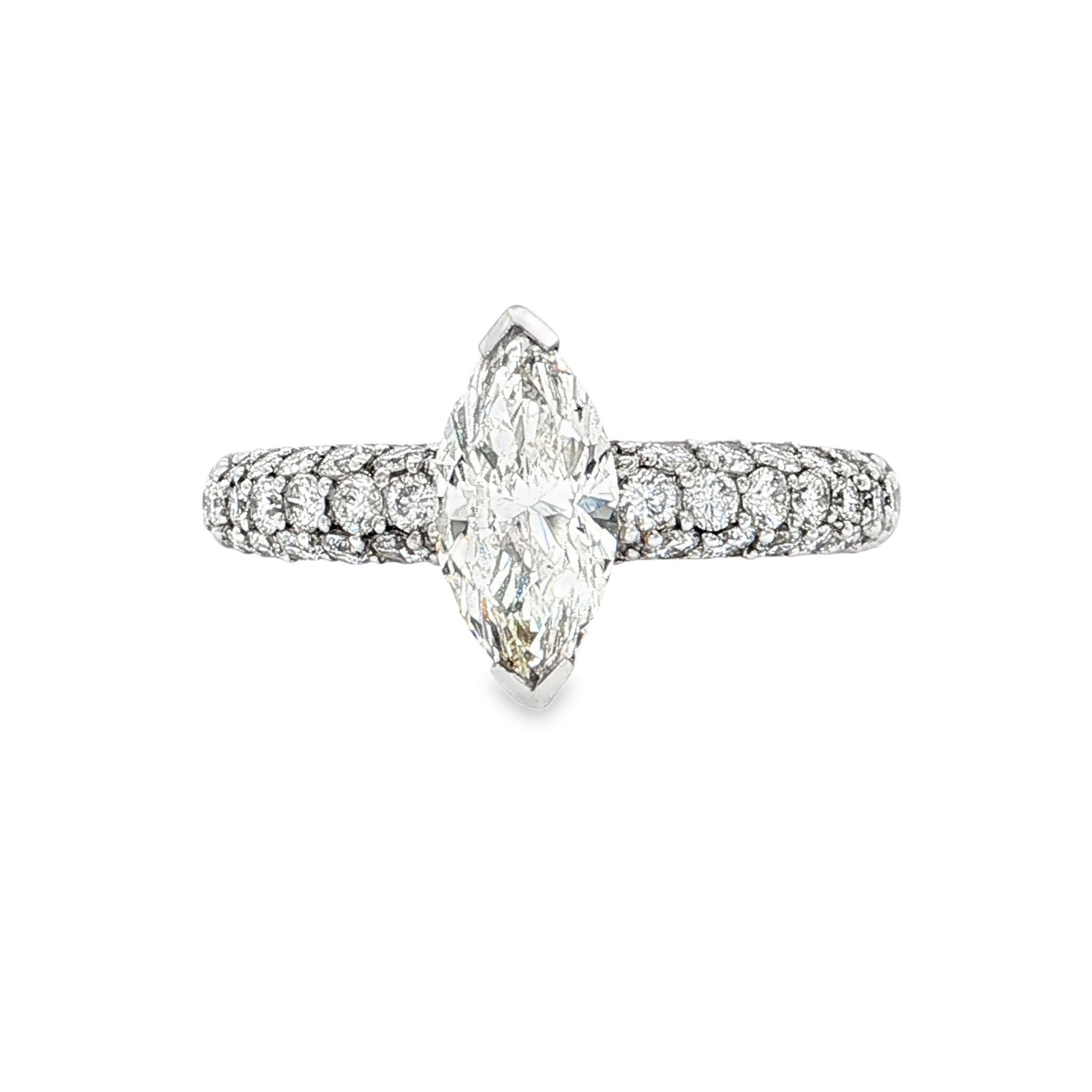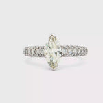 這款精美的多石戒指採用18K金底座,搭配優雅的白色黃金配色。主鑽為馬眼形切割,呈現出非凡的亮度和光彩。鑽石的獨特形狀和精湛切割工藝相結合,使其成為一件引人注目的珠寶。