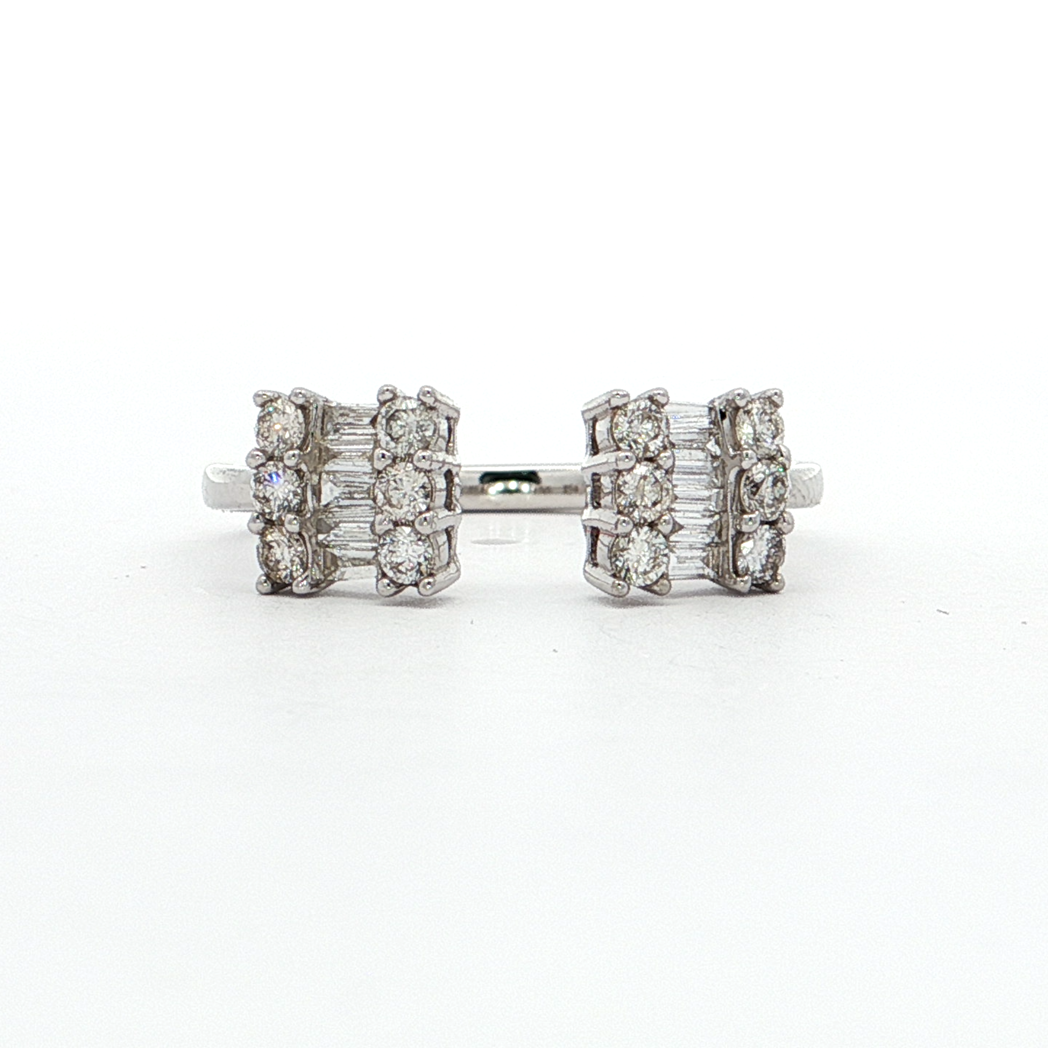 這款精美的多石戒指採用18K金打造,並鍍以亮麗的白金,散發出優雅的光澤。戒指上鑲嵌著多顆圓形明亮式切割的鑽石,璀璨奪目。鑽石的排列和設計巧妙,為戒指增添了現代感和獨特性。適合日常佩戴,也適合在特殊場合展現您的品味。